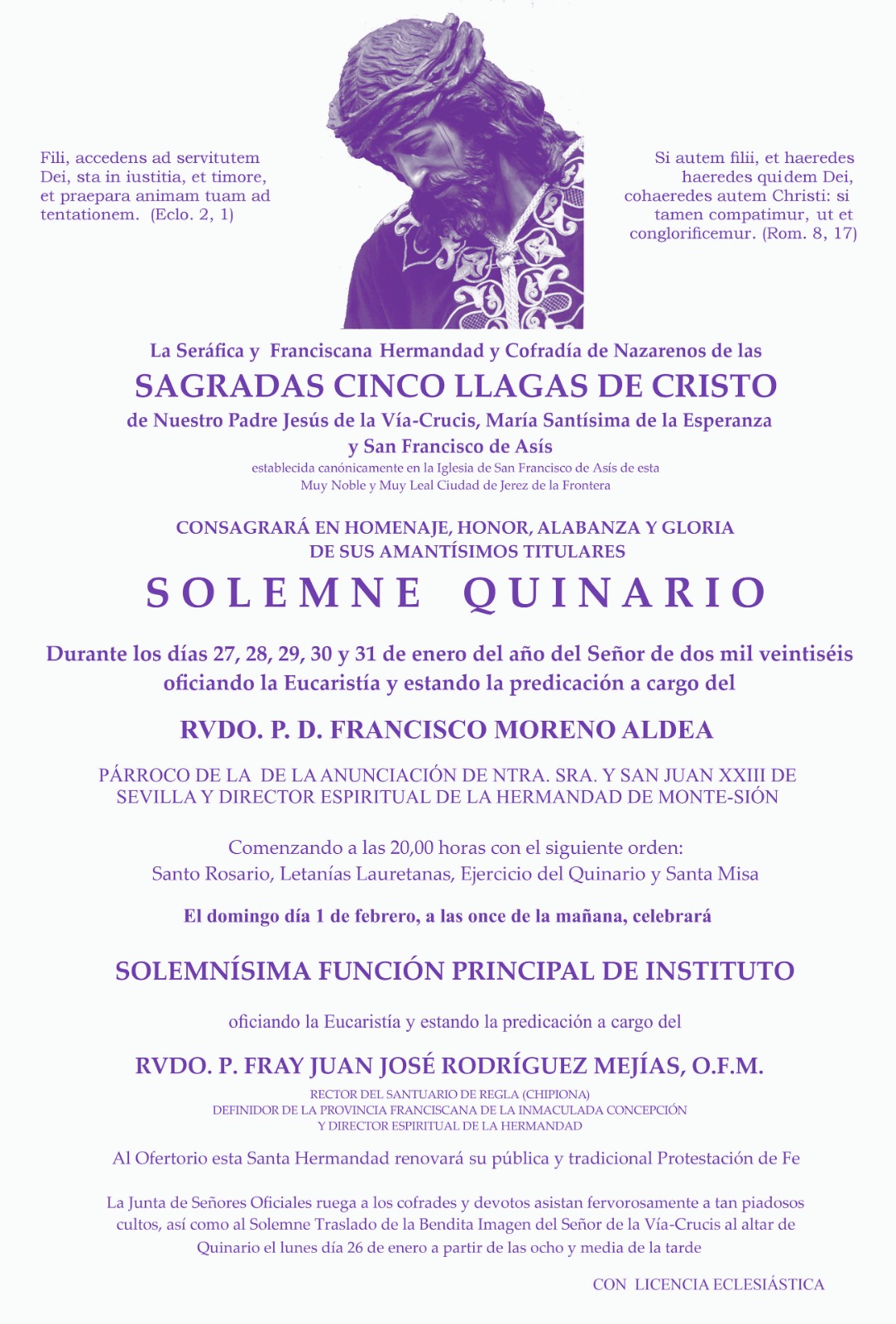 Como culminación de este ciclo cultual, el domingo 1 de febrero, a las 11:00 horas, se celebrará la Solemnísima Función Principal de Instituto, oficiando la Eucaristía y estando la predicación a cargo del Rvdo. P. Fray Juan José Rodríguez Mejías, O.F.M., rector del Santuario de Regla de Chipiona, definidor de la Provincia Franciscana de la Inmaculada Concepción y director espiritual de la Hermandad. Durante el ofertorio, la corporación realizará la renovación pública y tradicional de su Protestación de Fe.